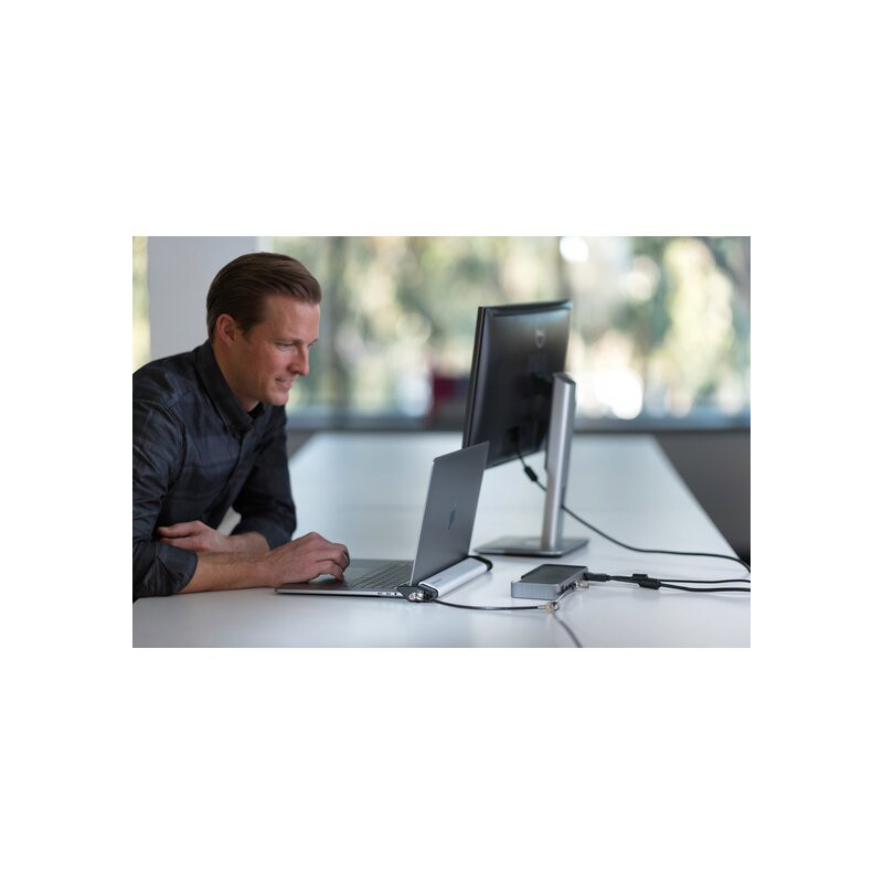 Sa conception de niveau professionnel offre une station de verrouillage élégante en aluminium brossé qui permet un accès latéral aux ports et une flexibilité supérieure pour l'utilisation d'un ordinateur portable.